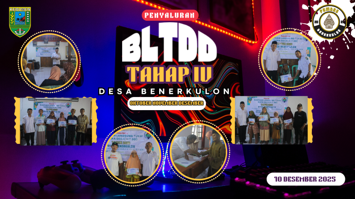 Benerkulon, 10 Desember 2025 — Pemerintah Desa Benerkulon kembali menyalurkan Bantuan Langsung Tunai Dana Desa (BLT DD) untuk Tahap IV, yang meliputi bulan Oktober, November, dan Desember. Sebanyak 27 Keluarga Penerima Manfaat (KPM) menerima bantuan tersebut dalam kegiatan yang berlangsung di Balaidesa Benerkulon.