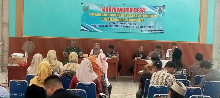 Pemerintah Desa Giwangretno hari ini Rabu 10 Desember 2025 menggelar Musyawarah Desa (Musdes) untuk membahas Rancangan Anggaran Pendapatan dan Belanja Desa (APBDes) Tahun Anggaran 2026 yang dilaksanakan di Gedung Serbaguna Giwangretno.